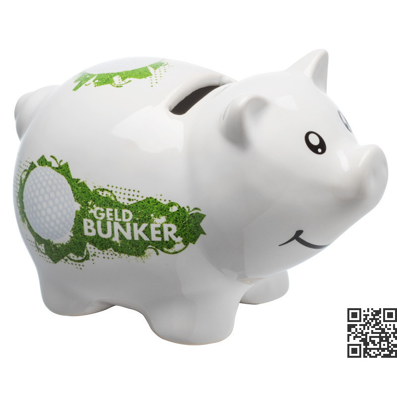 Una bonita hucha de porcelana con una inscripción "Geldbunker". (Búnker de dinero)
