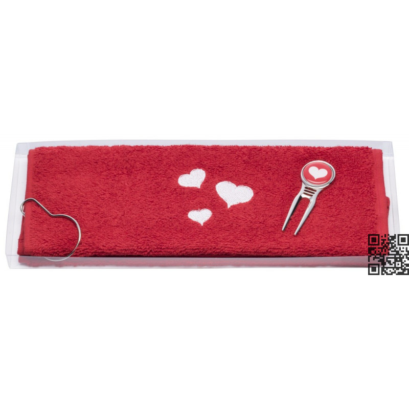 Toalla de Caddy bordada, con reparapiques, en caja transparente.