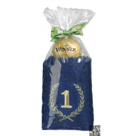 TOALLA DE GOLF WINNER En bolsa de regalo, disponible en color negro, con bordado de golfistas en blanco y rojo, y bola, blanca con rotulación motivo Happy Birthday.